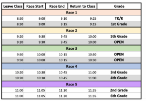 The Fun Run happens on Friday, the final day of spirit week. On that Friday, classes will take turns running. Parents and volunteers work to make the field fun and exciting with decorations, bubbles and music. After the race kids get an otter pop and participation prize. There will also be a grand prize of a Kona Ice party for 3-5 classes!