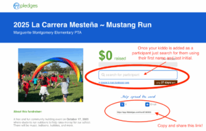 While the Mustang Run is a fun community building event, it is also a fundraiser. This year we will be using 99pledges to collect online donations. Students will not be added to 99pledges without parental consent. If you would like to donate by cash or check instead of through the 3rd party site, 99pledges, you absolutely can! Please include your child or teacher’s name. Donations can only be accepted by the front office, on 99pledges, or online via MME PTA square site. Do not give donations to your teachers. Please make all checks payable to MME PTA.