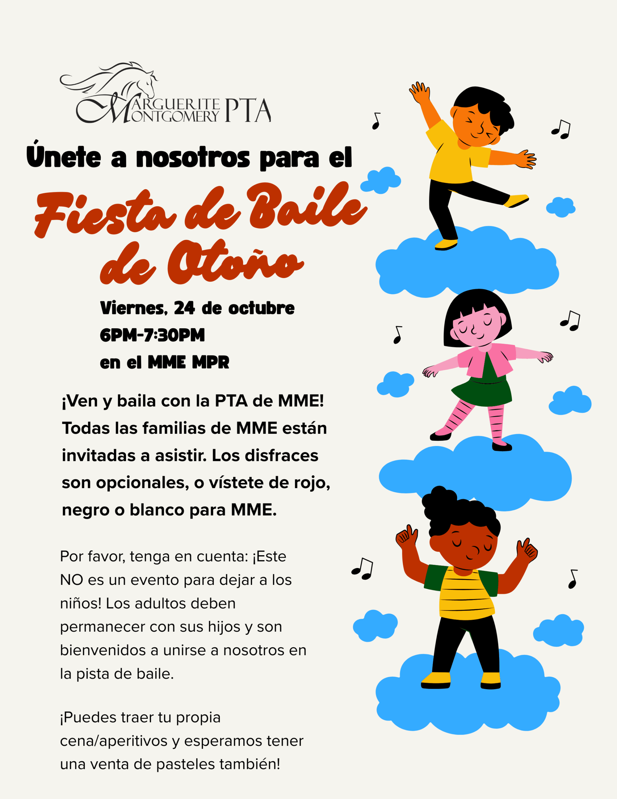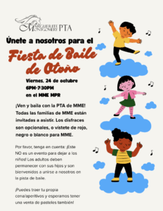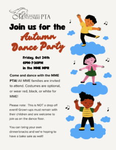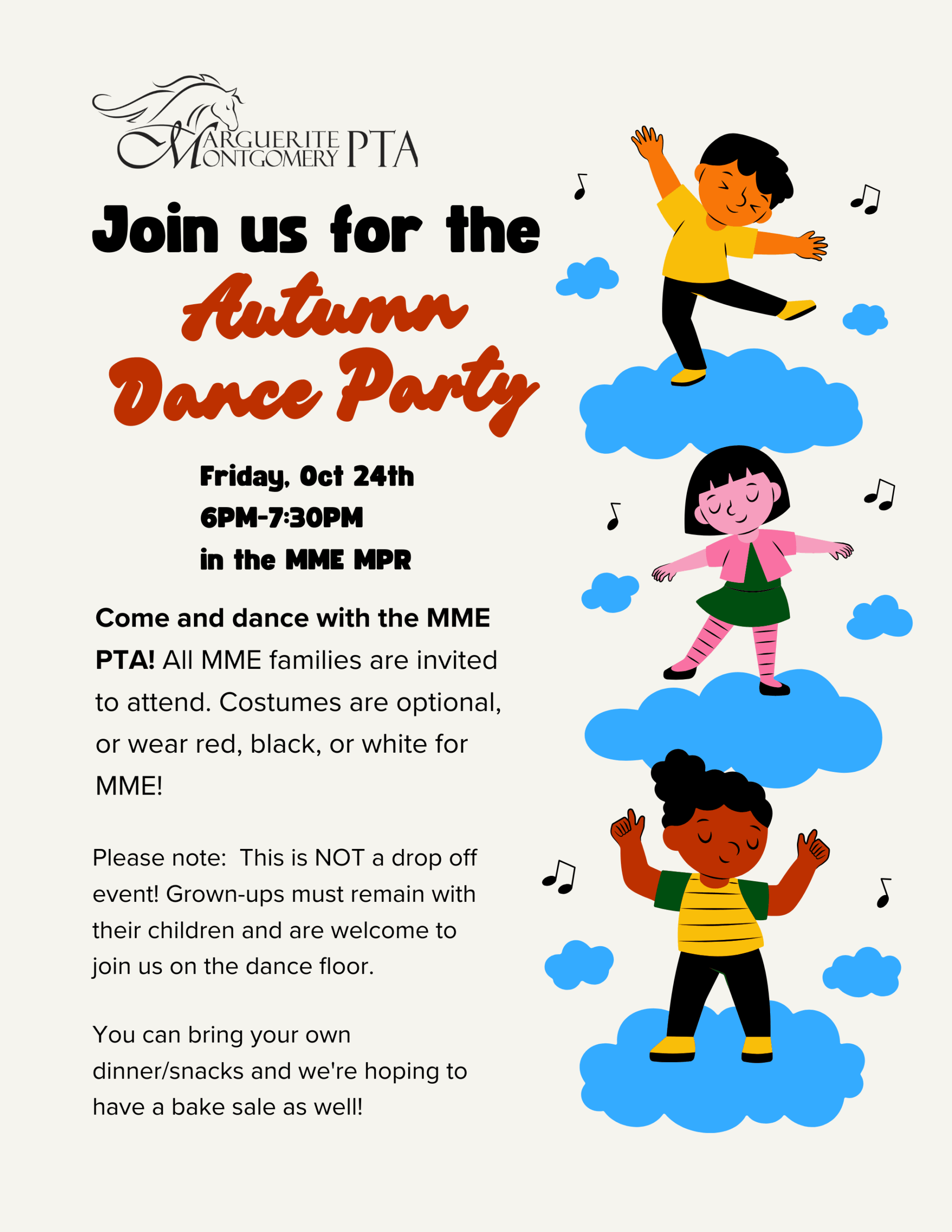 MME PTA hosts a Spring Dance for the 5th 6th grade students. This has been a drop off event, and so we need parent volunteers to stay and monitor students and keep the event fun and safe.